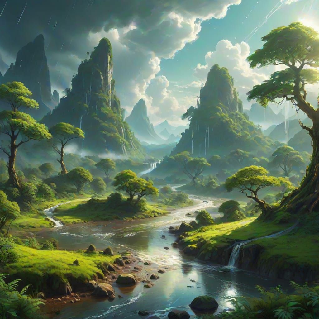 This image shows a vibrant, panoramic fantasy landscape featuring giant forests and golden rivers on a lush, green planet. The scene is bathed in warm sunlight, with sparkling silver rain creating a dreamlike, ethereal quality as a hyper-realistic oil painting.