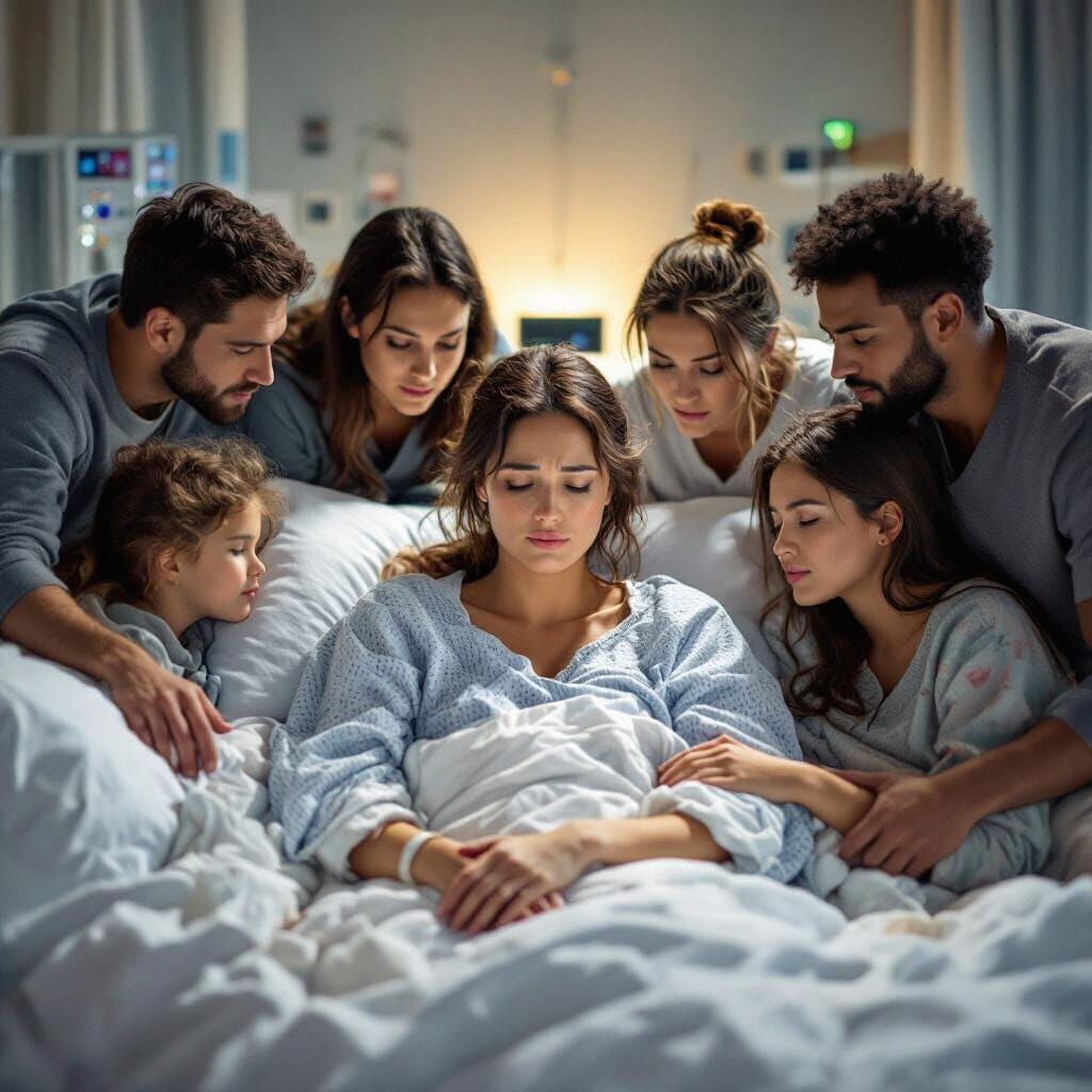 A poignant image shows a sorrowful woman in a hospital bed, surrounded by concerned family and friends. The scene evokes dramatic lighting and intense emotion, reminiscent of impasto paintings.