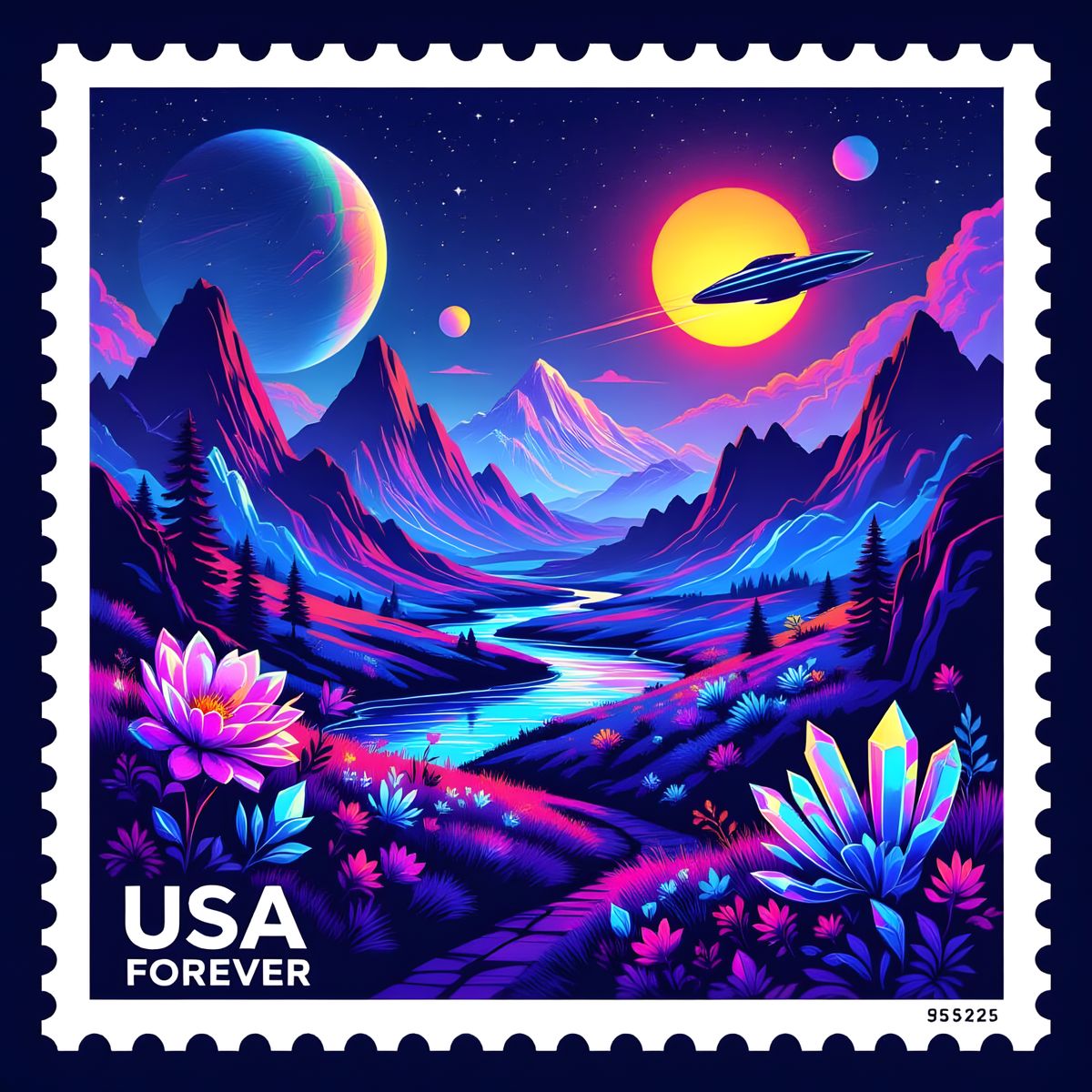 This image shows a futuristic exoplanet with neon flora and crystalline mountains under twin suns. A spaceship silhouette and holographic effects enhance the surreal, sci-fi aesthetic, like a US postage stamp.