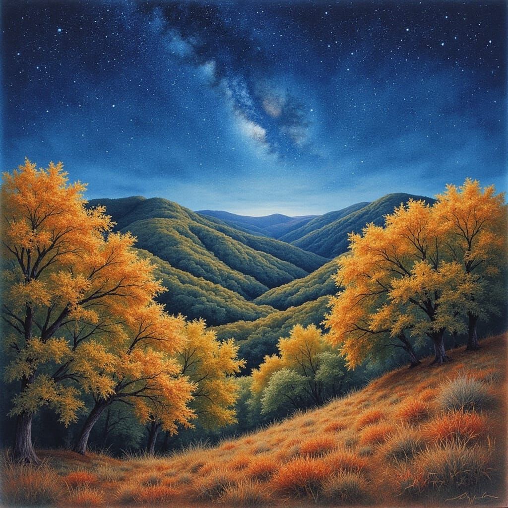This image shows an oak forest on rolling hills beneath a starry night. Autumn foliage is visible, and the watercolor painting style uses soft, rich colors to create a masterpiece.