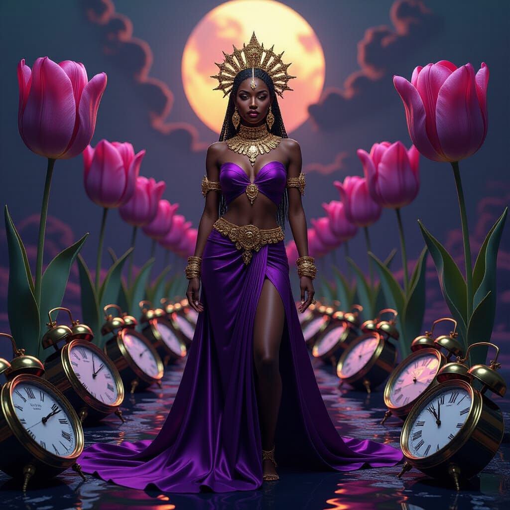 This hyperrealistic digital art features an opulent African goddess with obsidian skin, adorned in gold and silks, against a surreal backdrop of melting clocks and luminous tulips. Dramatic lighting enhances the dreamlike opulence.