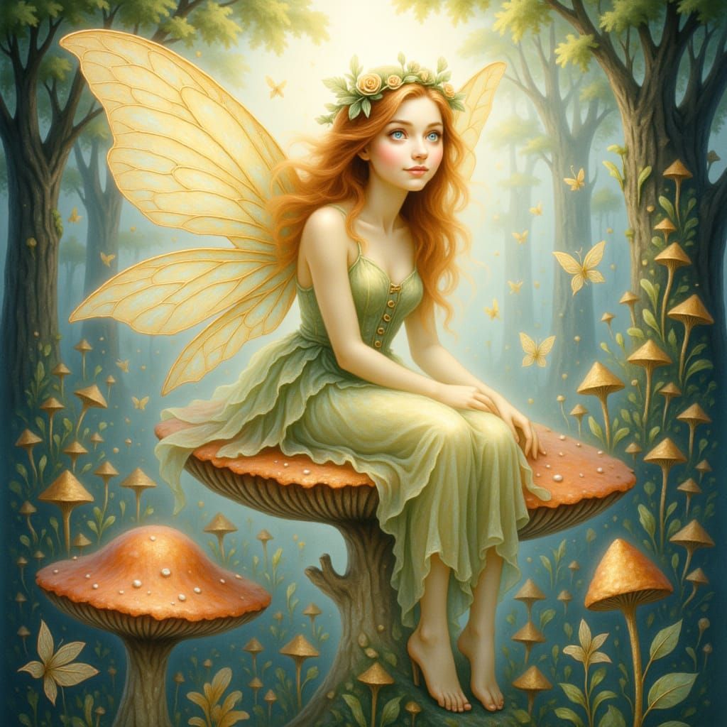This image shows a fairy with iridescent wings sitting on a glowing mushroom in a magical forest. Soft pastel colors and delicate watercolor brushstrokes create a dreamy, ethereal atmosphere.