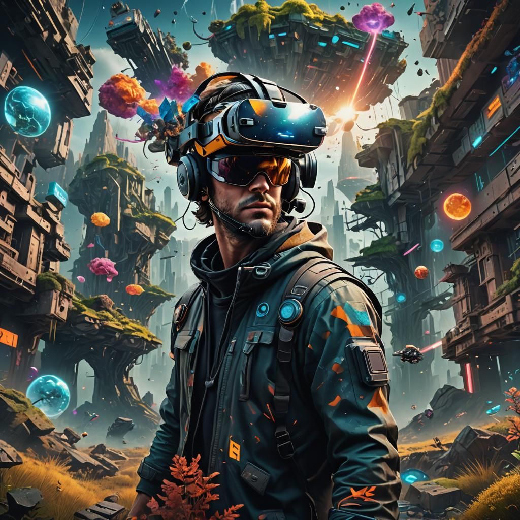 A detailed digital painting of a man wearing a VR headset immersed in a digital world. The artwork features intricate details and complementary colors, rendered as fantasy concept art.