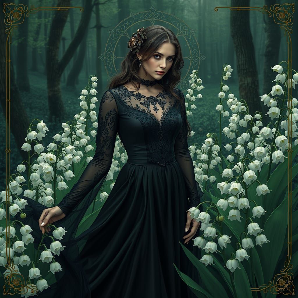 This image depicts a woman in flowing black attire, surrounded by lush lily of the valley flowers, in a mystical atmosphere with intricate gothic patterns and sacred geometry, evoking an ethereal and enchanted bohemian feel.