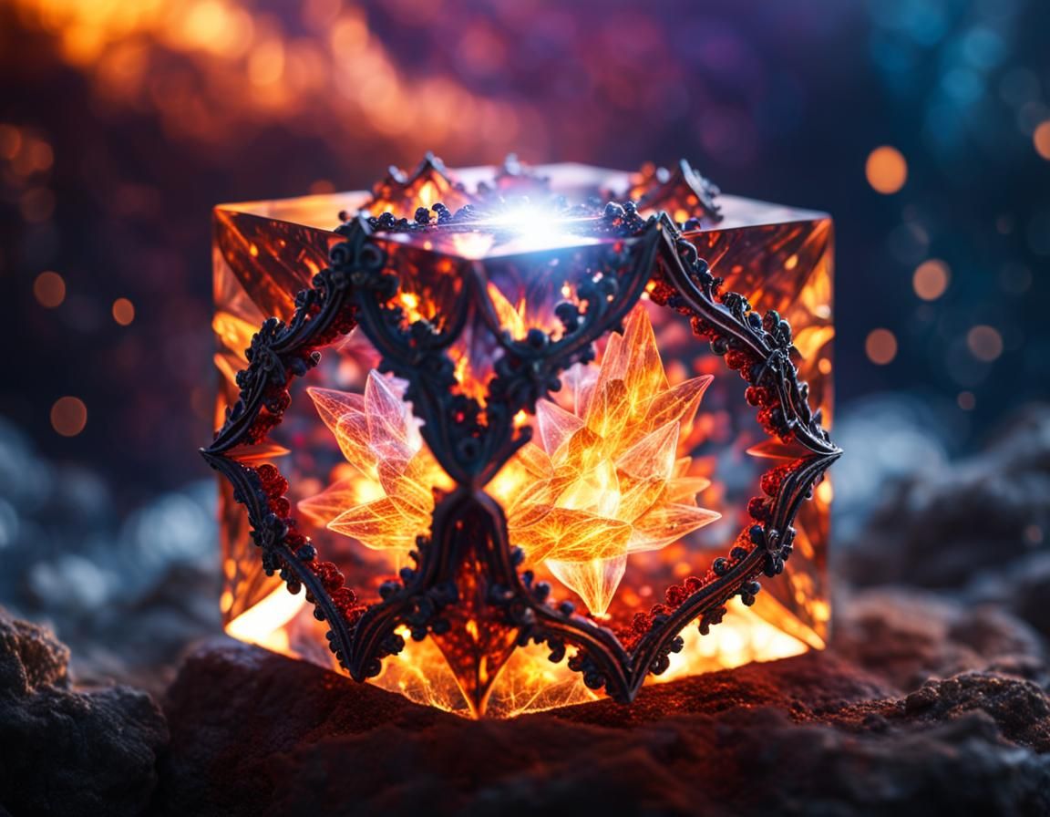 This image shows a fire elemental imprisoned within a crystal cube. The digital artwork features intricate ornamentation, a bokeh effect, and a galaxy-blurred backdrop in 8K resolution.