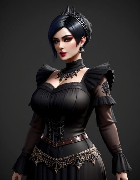 A stunningly detailed, realistic portrait of a curvy, middle-eastern woman in her fifties, dressed in a dark red gothic gown with a pixie cut. Rendered in 8k with Unreal Engine 5.