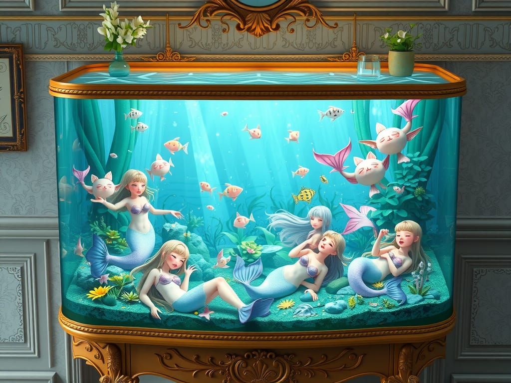 This image features a stunning, intricately designed aquarium with lush aquatic plants and vibrant decorations, teeming with anime-inspired mermaids in various hues and sizes, lounging about the aquarium floor in a tranquil, dreamlike atmosphere, reminiscent of the aesthetics of #genshinimpact.
