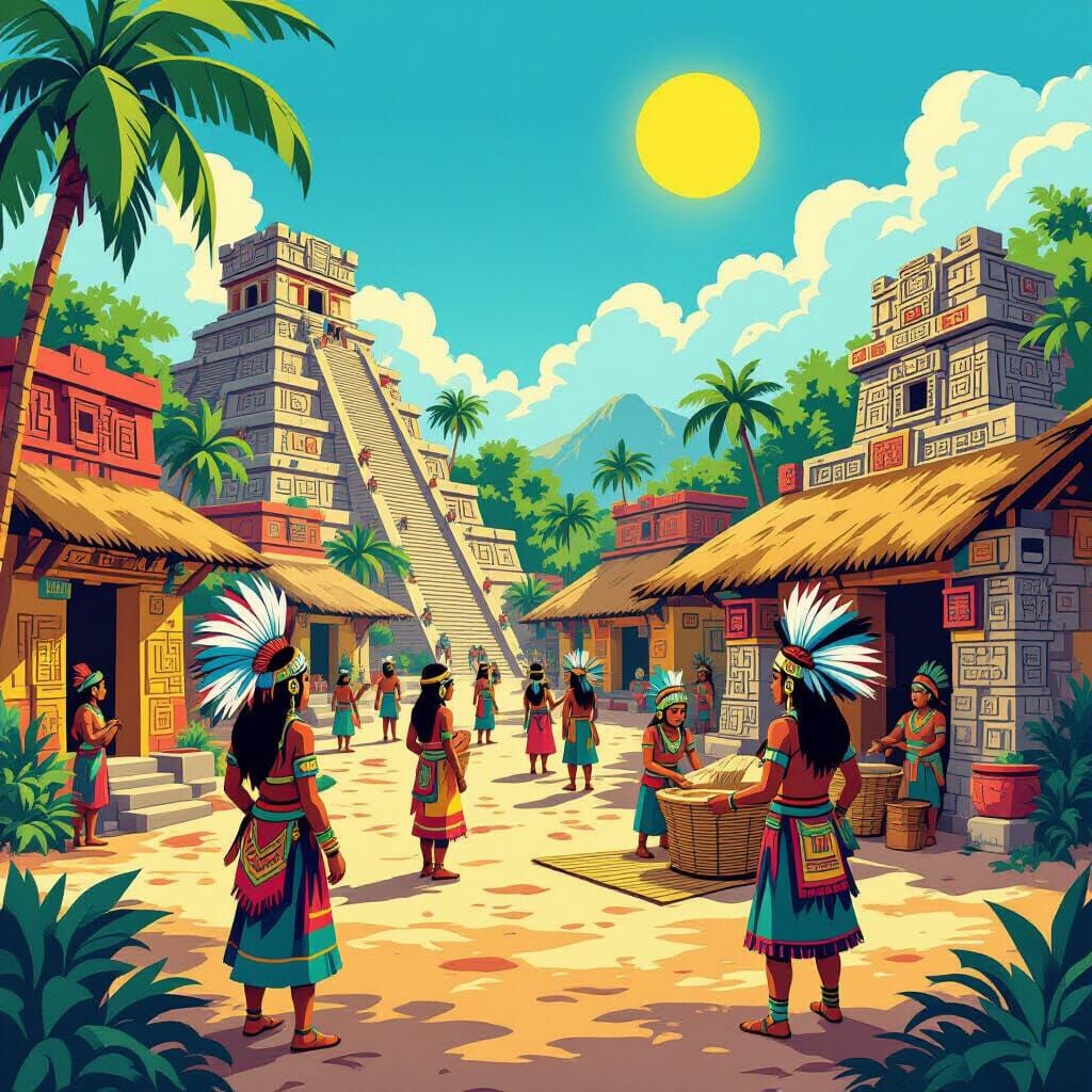This image shows a vibrant Mayan village with people in traditional attire. The scene features Mayan architecture and is rendered in a bold graphic novel art style with flat colors and strong outlines.