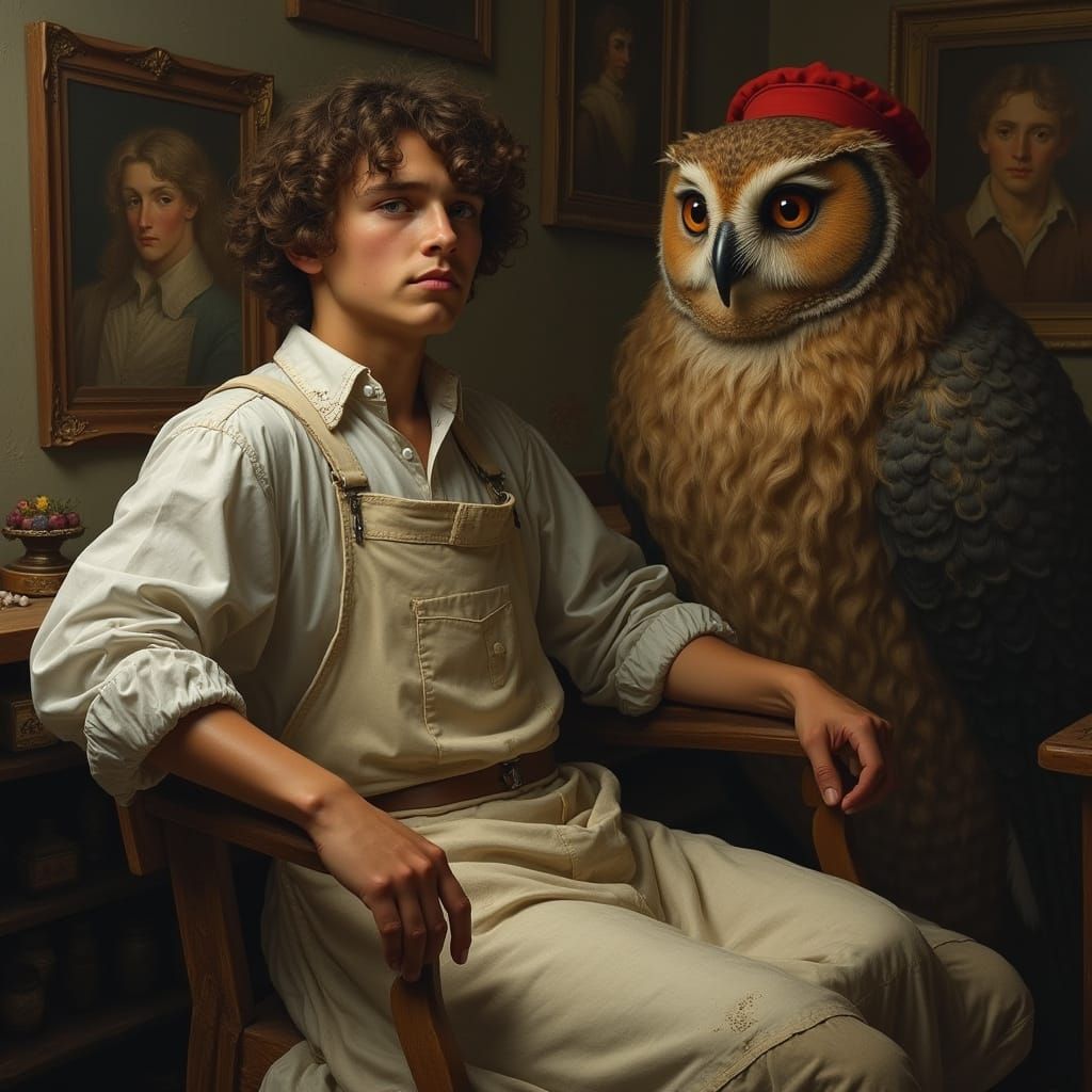 This image depicts an 18th-century barber shop scene with a young man and a whimsical owl-like figure. Rendered with rich, painterly textures and soft lighting for a dreamlike feel.