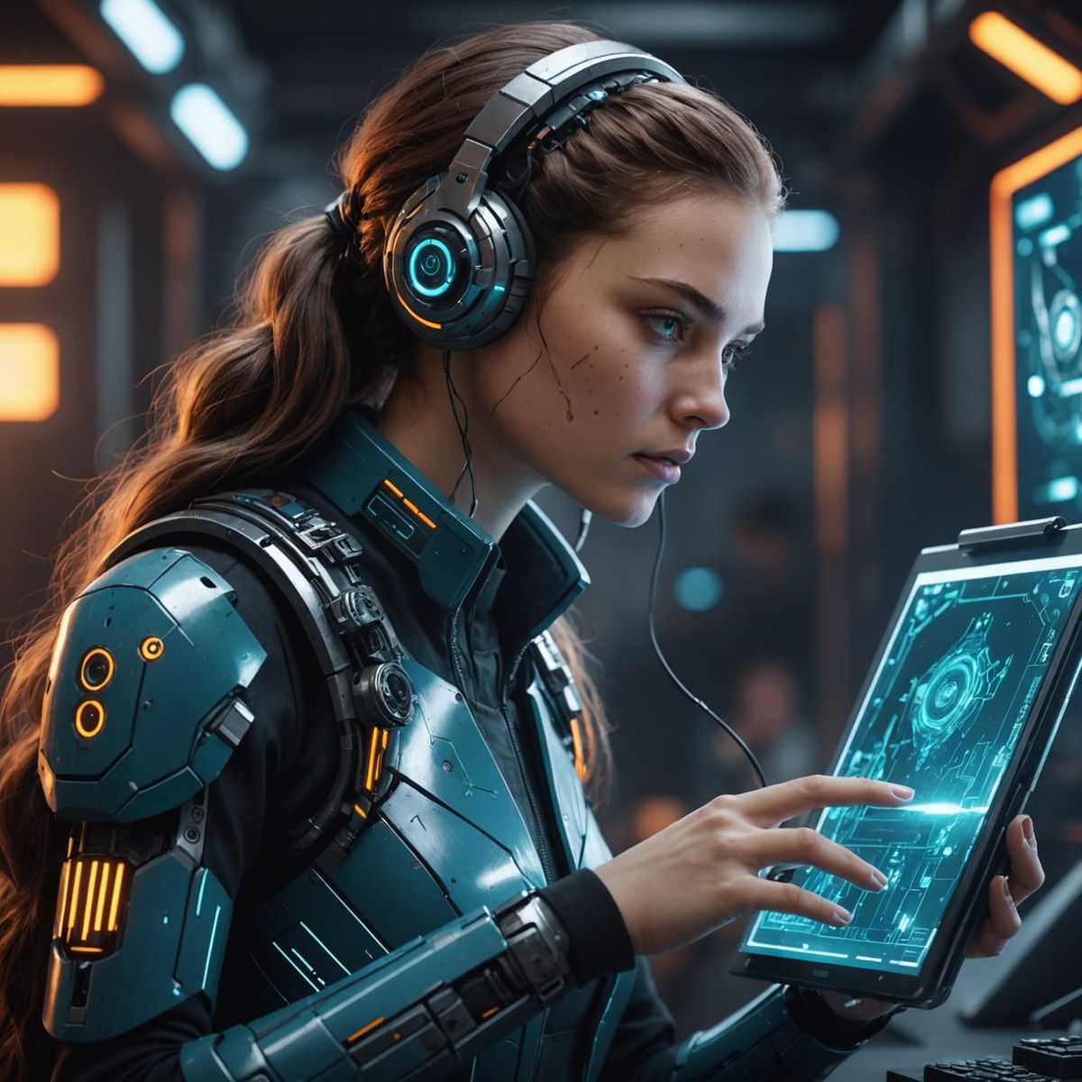 This image shows a woman with cybernetic enhancements holding a clipboard while looking at a monitor. Rendered with intricate detail, complementary colors, and a matte painting finish.