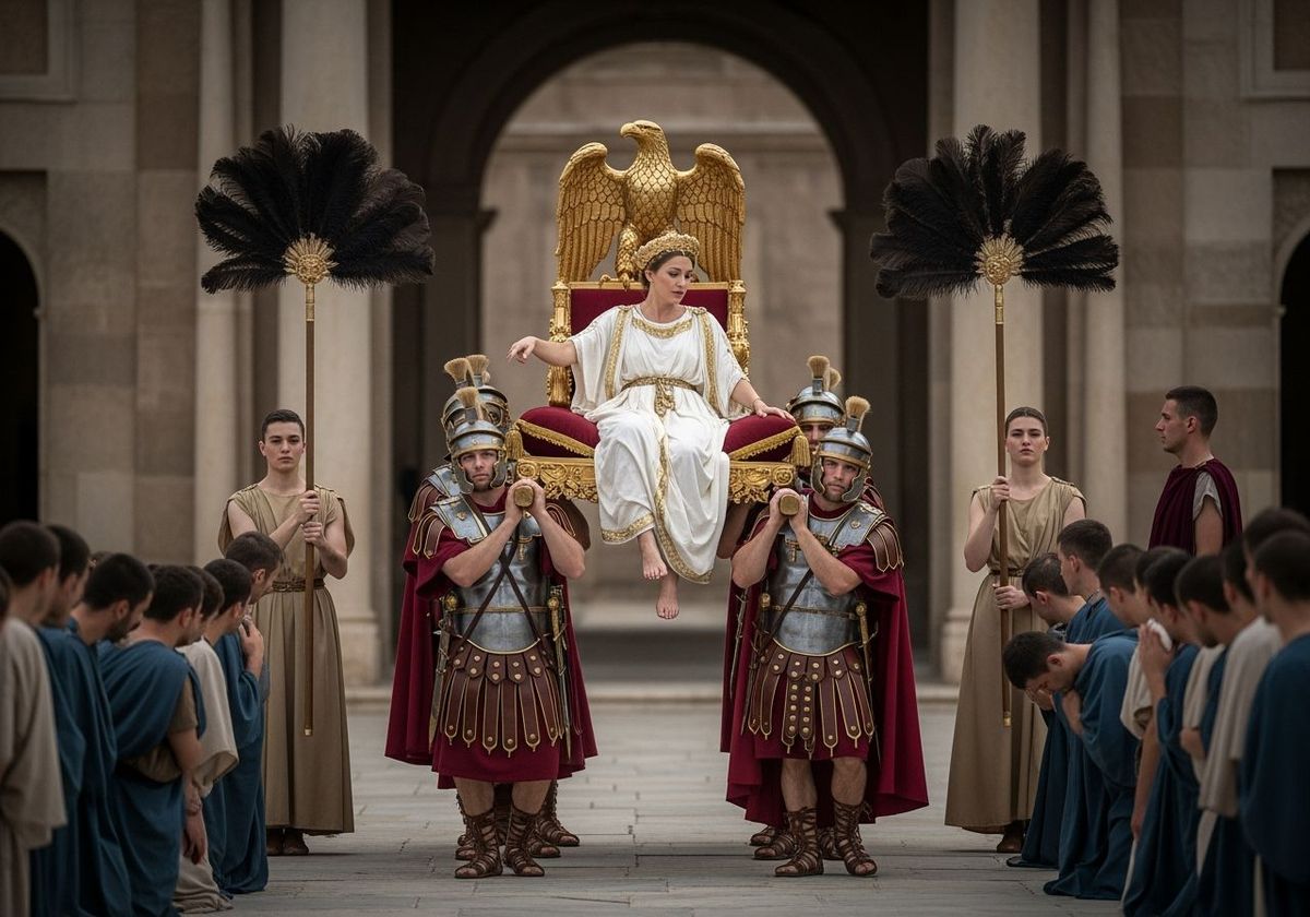 This image shows a Roman Empress in a white and gold toga, carried on a golden eagle throne by Roman soldiers. Servants with feather fans and kneeling peasants are also present, captured with a bokeh effect and natural lighting.
