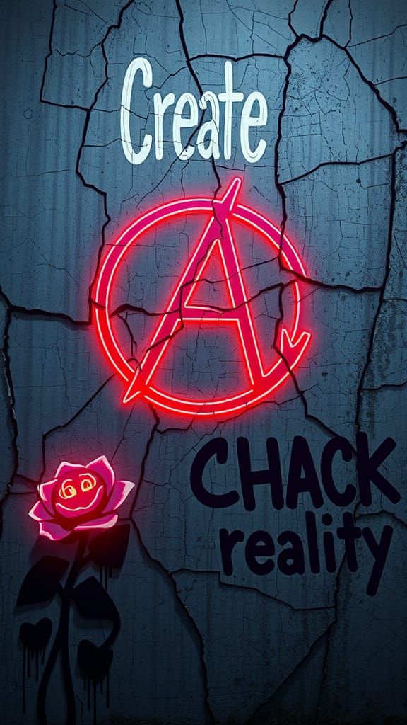 A digital rendering of a cracked concrete wall featuring a neon anarchy symbol. The image, set in a cyberpunk aesthetic, includes glowing flowers and graffiti-covered advertisements.