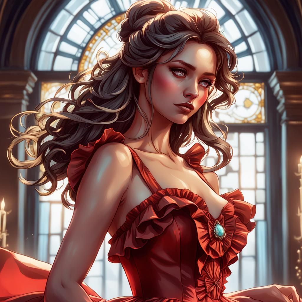 This image shows a head and shoulders portrait of a girl in a red dress. The concept art features dynamic lighting and intricate details, rendered with triadic colors.