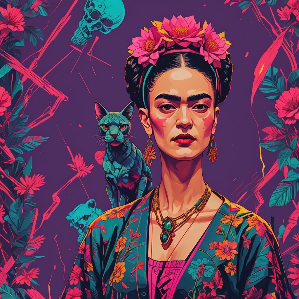 This image depicts a Frida Kahlo-inspired artwork with holiday themes. It is rendered with minimalist, modern techniques, featuring a cyberpunk aesthetic and neon color palette.