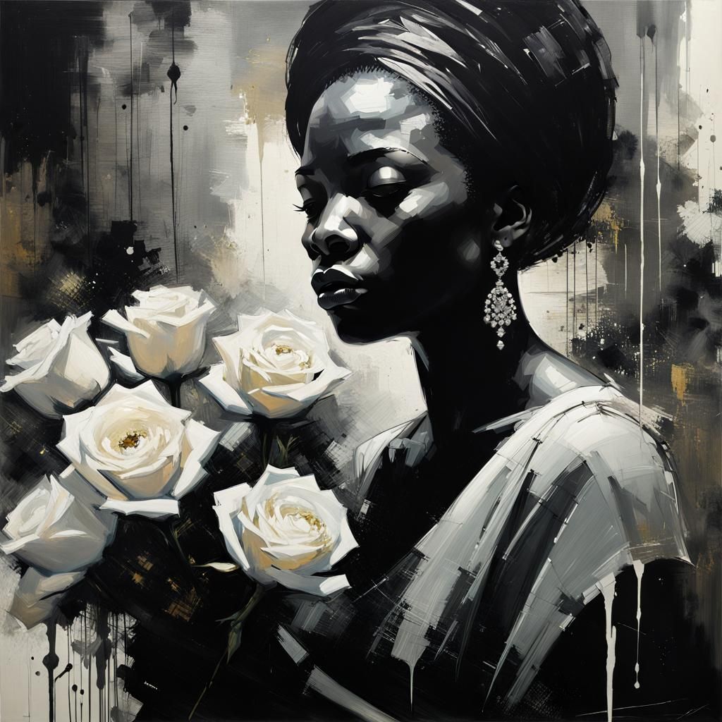 A striking picture of a black opera singer on stage with white roses. The image evokes a vintage feel, reminiscent of a black and white oil painting with bold brushstrokes.