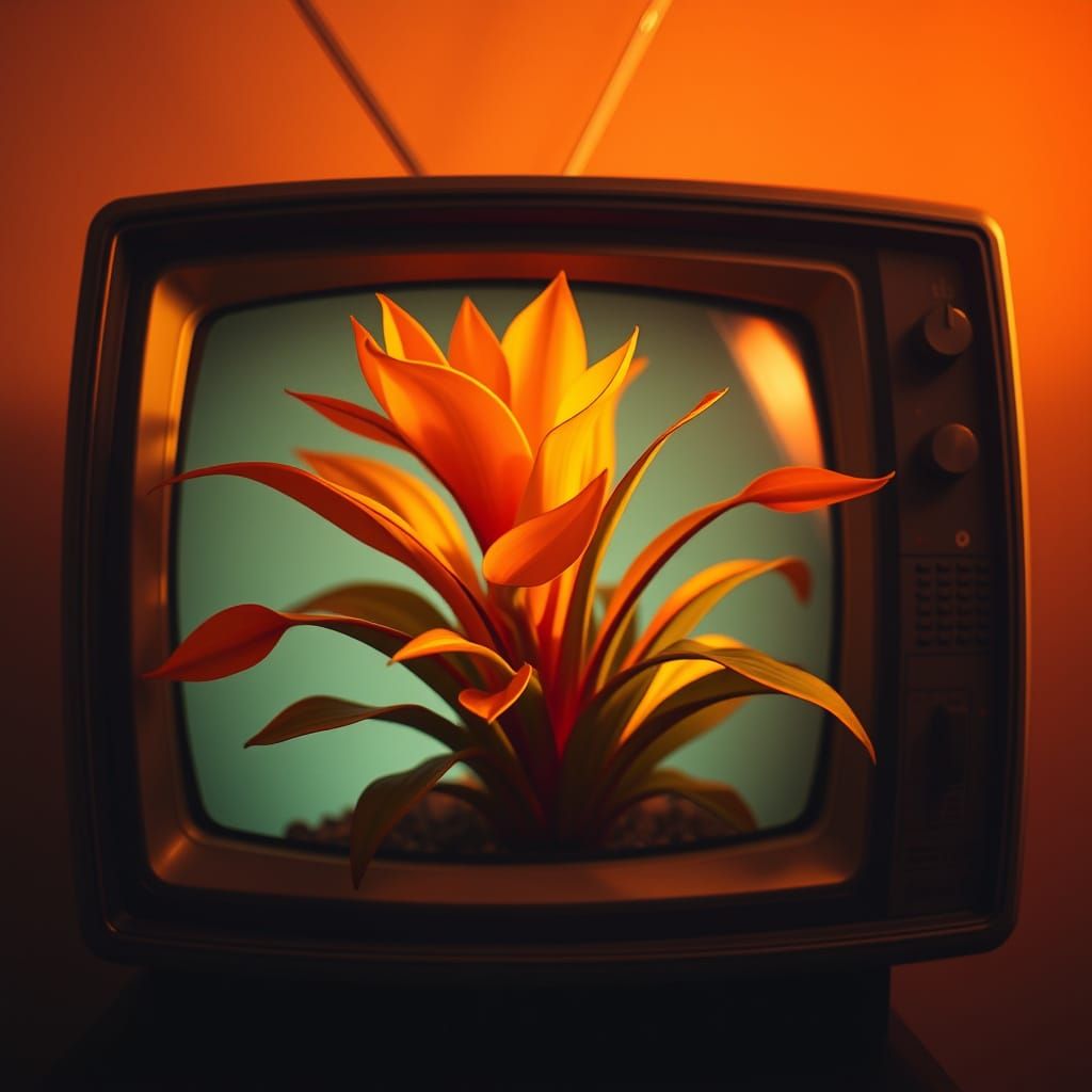 A close-up image shows a vibrant orange plant erupting from a vintage television screen. The image features soft lighting, cinematic bokeh, warm hues, and textured details, realized with gritty, dreamy realism.