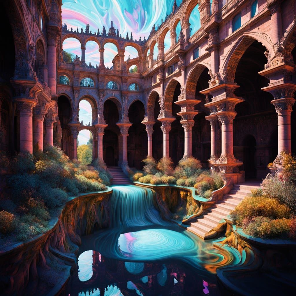 A dreamlike image of the Würzburg Residenz's façade transformed into a surreal, neon-lit wonderland with swirling colors, fractal patterns, and impossible geometry, evoking a sense of uncanny and unsettling atmosphere.