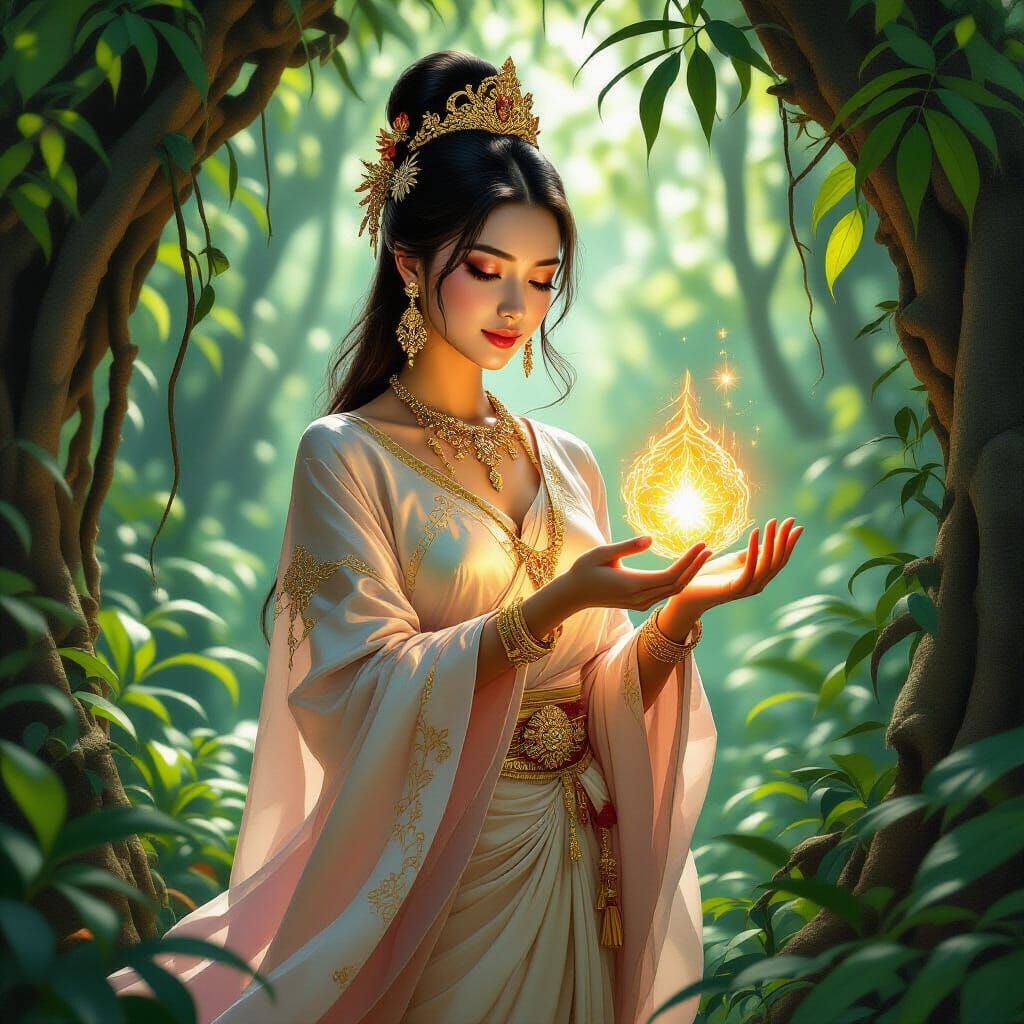 This oil painting depicts a serene Thai princess in a hidden jungle clearing. She wears silk robes and golden jewelry, holding a mystical glowing artifact as sunlight filters through the trees. Rich textures and vibrant colors define the scene.