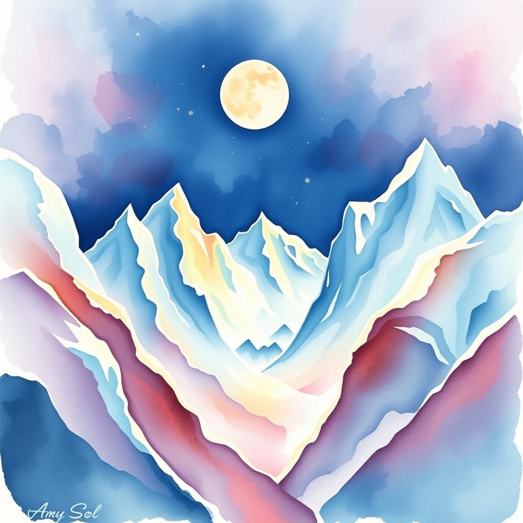 This image shows a dreamlike landscape of icy mountains, painted in a vibrant watercolor style with jewel-toned hues, evoking the emotional intensity of expressionist art.