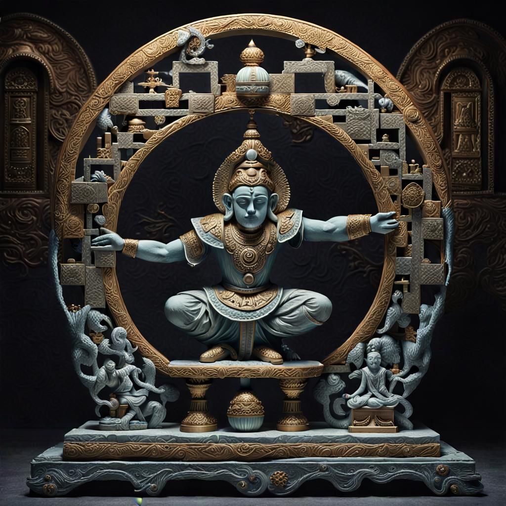 A vibrant image depicting infinite consciousness and enlightenment. The artwork features rich colors, intricate carvings, and elements of selfness, rendered with sharp focus and amazing depth in a magic realism aesthetic.