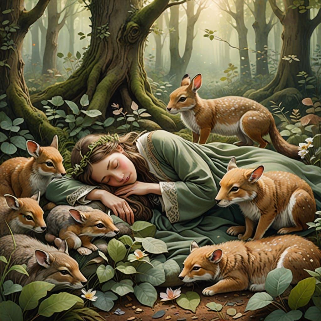 A serene watercolor-inspired illustration of a female druid sleeping peacefully amidst forest animals, surrounded by soft focus, warm light, and earthy tones.