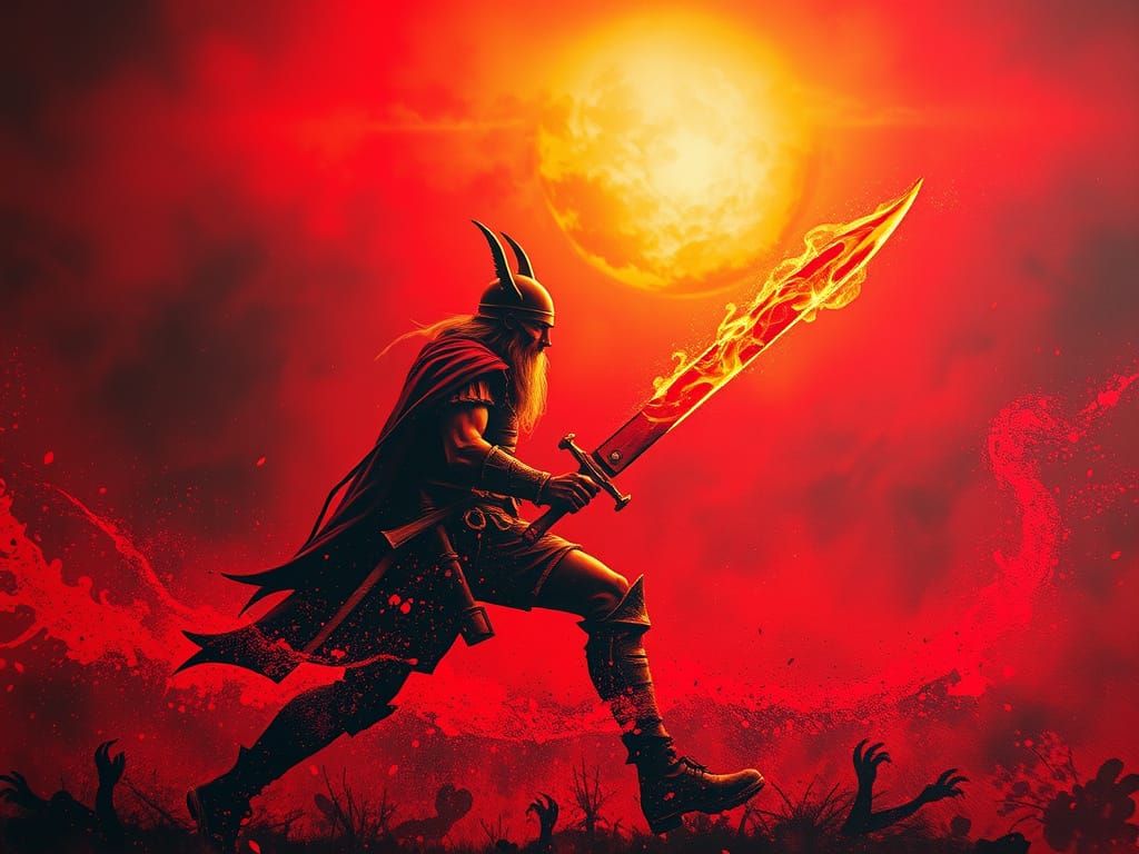 from Elodie Amadee's dream world :: Bright summer, red flame Soot painting, against a fierce burning sunset a ethereal whimsical burntred Viking warrior showing glowing firered klimtquantum flamesword and burning particles on red paper, fierce bloodybattle, soot painting technique, enchanted meadow, ...