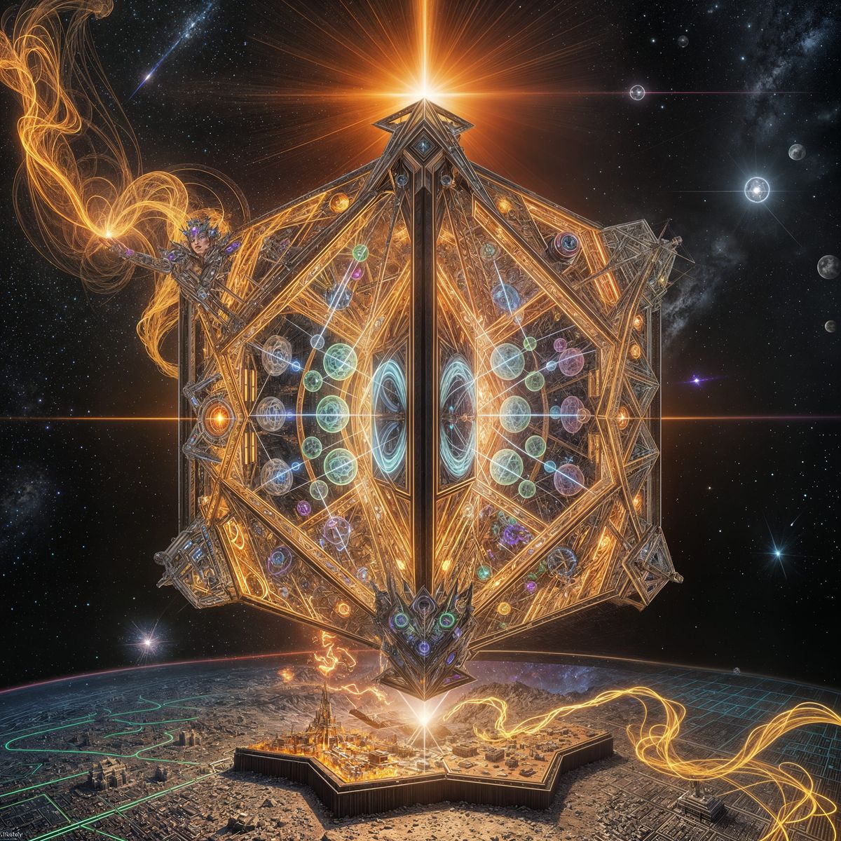 A striking digital artwork displaying complex, levitating hypercube artifacts. The piece showcases a vibrant, high-detail scene with transdimensional elements and advanced technology powering interconnected systems.