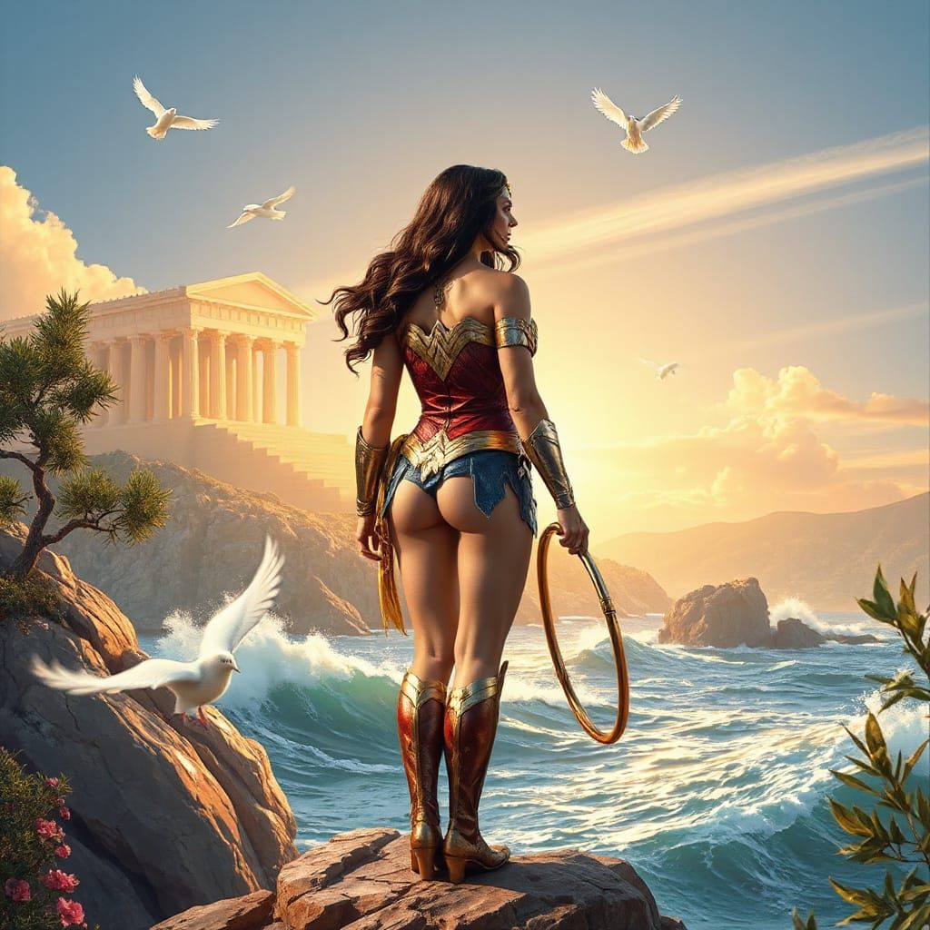 This image depicts Wonder Woman heroically standing on a rugged cliff's edge, gazing out at the serene island of Themyscira bathed in warm, golden morning light. The scene features intricate architecture, doves, and a lush tropical landscape, rendered in a style reminiscent of the old masters, with drama...