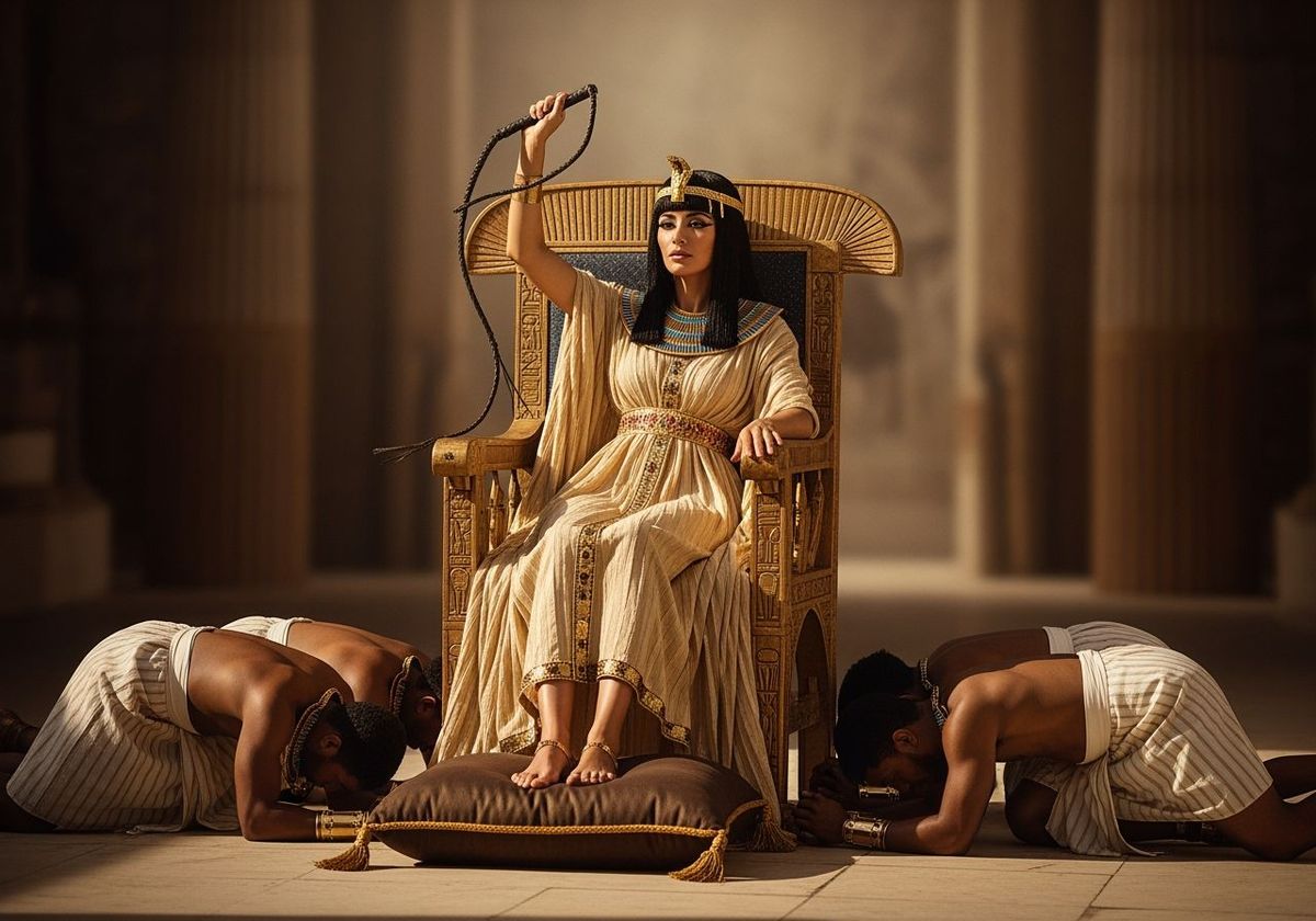 This image shows an Egyptian queen on an Isis throne, servants at her feet. She holds a whip, the scene lit with warm light and a shallow depth of field. The image evokes high-resolution photographic styles.