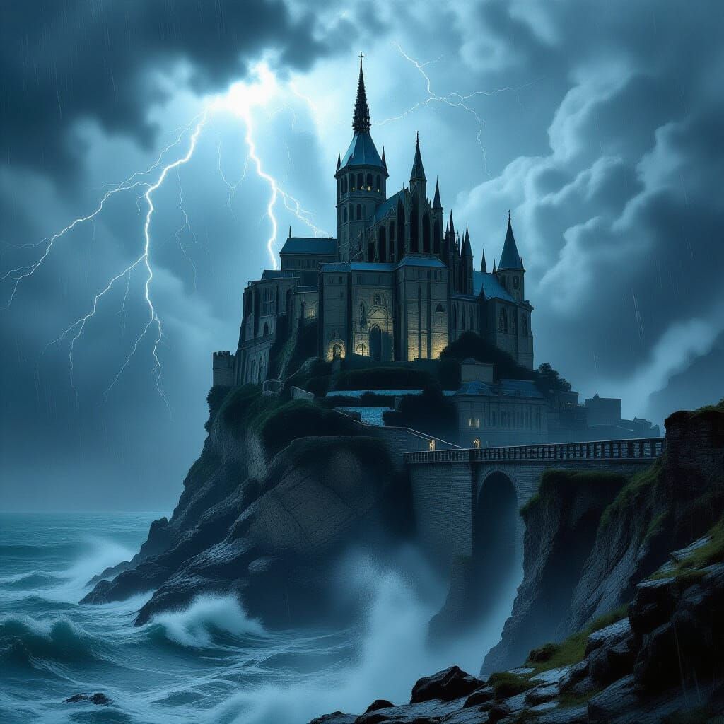 This image depicts a grand, ancient castle on a sharp cliff above a rough sea. Gothic architecture stands out against a dark, stormy sky with lightning.