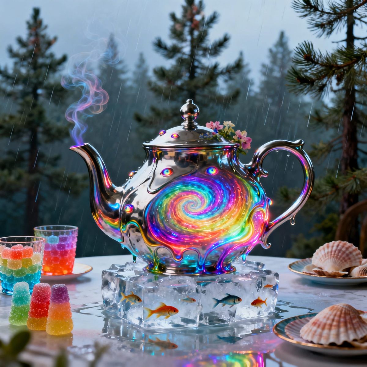 This image depicts a bizarre, liquid metal teapot swirling with infinite rainbow colors. It glows with shifting hues and rests on an ice table, surrounded by surreal elements.