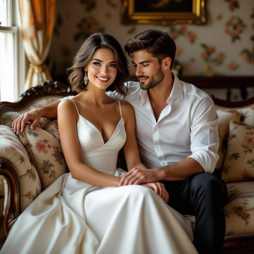 A vibrant 3D render of a couple sharing a tender moment in a Victorian room. A fair-skinned woman in a white gown sits next to her athletic boyfriend in this cozy scene, bathed in warm, golden light.