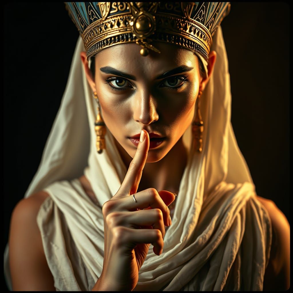 This haunting portrait captures the essence of an ancient Egyptian beauty, blending elegance and terror, with a ghostly aura and piercing gaze, as if frozen in time, amidst cinematic lighting and dramatic shadows, reminiscent of epic, live-action filmmaking