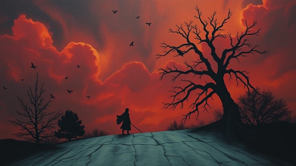 This image depicts a pointillistic sculpture set against a stormy sky, rendered with painterly techniques. The artwork evokes a sense of Japanese horror in a painterly style.