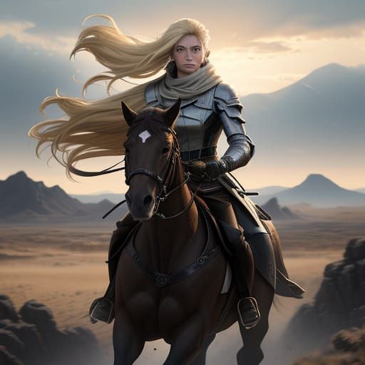This 3D anime digital painting features a determined blonde woman riding a horse through a desolate landscape with epic lighting and ultrafine detail.
