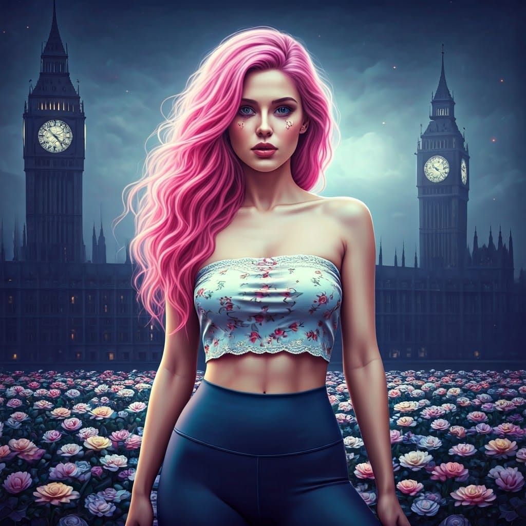 This image shows a model with flowing pink hair in a floral tube top and leggings, posed in a pastel flower field. Skyscrapers fade into the misty background under soft moonlight, in a dreamy aesthetic.
