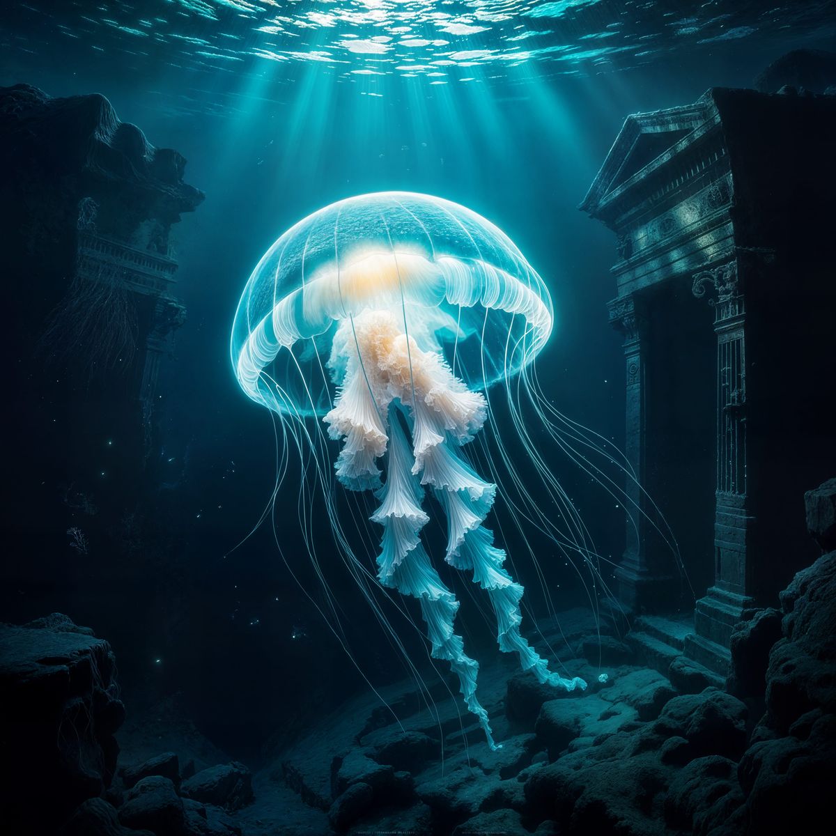 This hyperrealistic image shows a glowing jellyfish in a dark trench illuminating submerged ancient ruins. The detailed scene evokes deep-sea exploration and surreal underwater art.