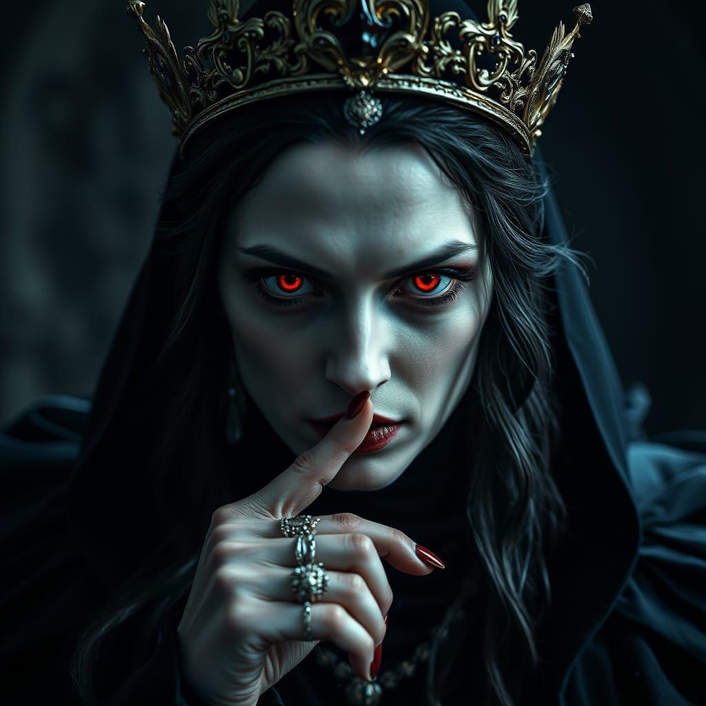 A haunting portrait of an ancient vampire queen, exuding eerie beauty, with piercing red eyes, adorned with a regal crown, and a commanding gaze, rendered in exquisite cinematic detail with subtle film grain and a rich color palette.