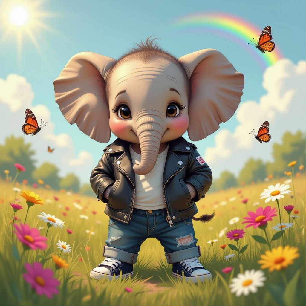 This image shows a baby elephant wearing a leather jacket and sneakers, standing in a sunny meadow. Butterflies, wildflowers, and a rainbow add to the whimsical digital art style.