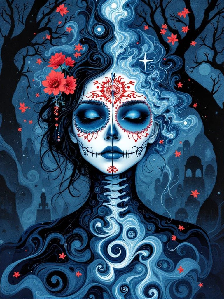 This serene image showcases a mysterious woman standing in an overgrown graveyard, bathed in the soft glow of the moon. Delicate, organic patterns in traditional Japanese suminagashi style evoke a sense of meditative calm, with intricate designs that seem to ripple and flow like water.