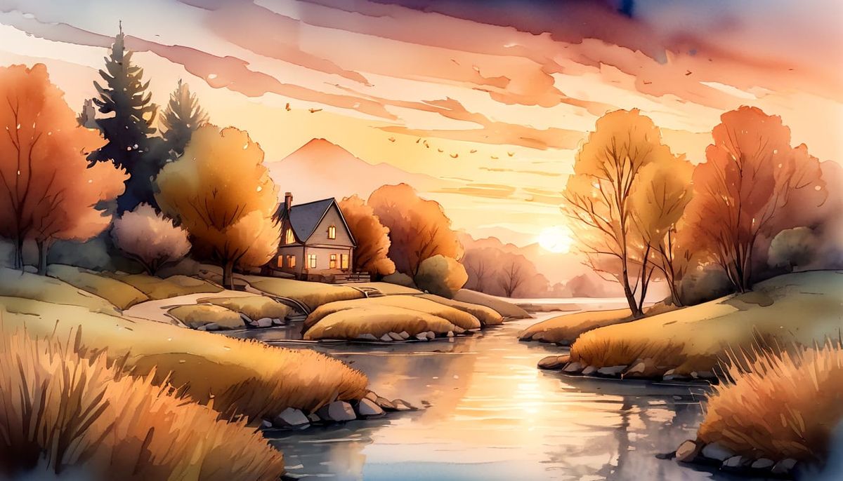 This serene watercolor illustration captures a peaceful autumn evening with a vibrant sunset reflecting off a winding river, featuring soft brushstrokes and delicate pen outlines.