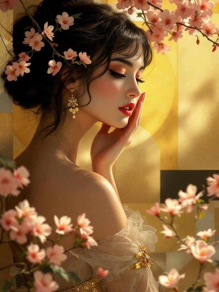 This image shows a vintage pin-up figure merged with a Mondrian-inspired abstract study. The figure is set against an abstract geometric background blending into a retro garden scene with cherry blossoms, utilizing soft-focus and airbrushed perfection.