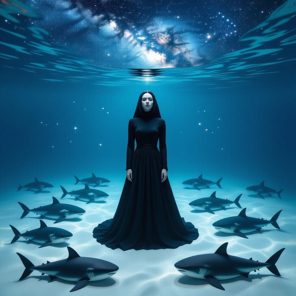 This image shows a solitary figure in black, with a serene face, surrounded by sharks in a dark fish tank. Soft light illuminates the scene in a hyperrealistic digital art style.