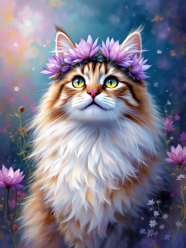 This beautiful fine art painting features a serene long haired cat adorned with a delicate purple lotus flower garland, set against a vibrant and dreamy impressionist backdrop with bold brushstrokes and vivid colors.