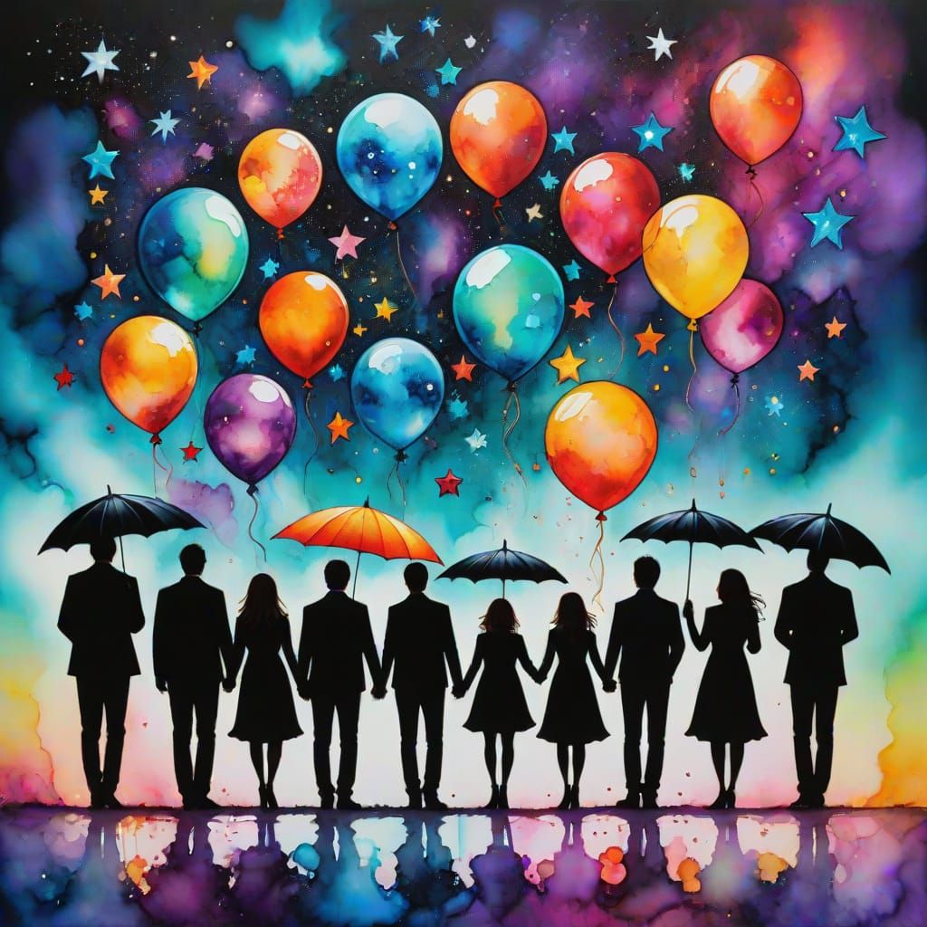 This image shows a colorful, quirky family holding balloons under a cosmic sky. Rendered in an abstract fluid art style, the scene features vibrant, bleeding colors and a luminous, otherworldly aesthetic.