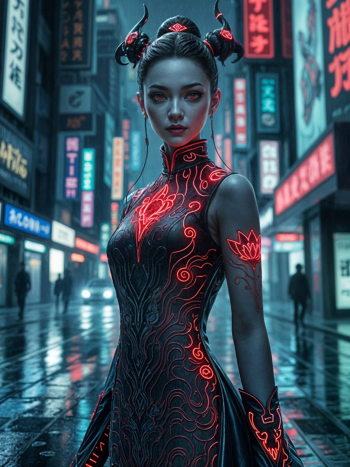 A striking picture of a Jiangshi in a cyberpunk setting. The pale figure is adorned with neon lights and circuit patterns in a dark fantasy aesthetic. Rain reflects holographic images on city streets.