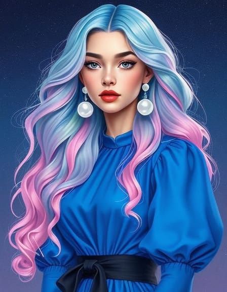 This image shows a hyperrealistic portrait of a young woman with pastel ombre hair and pearl earrings, wearing a blue dress. The image is digital art in a fantasy style.