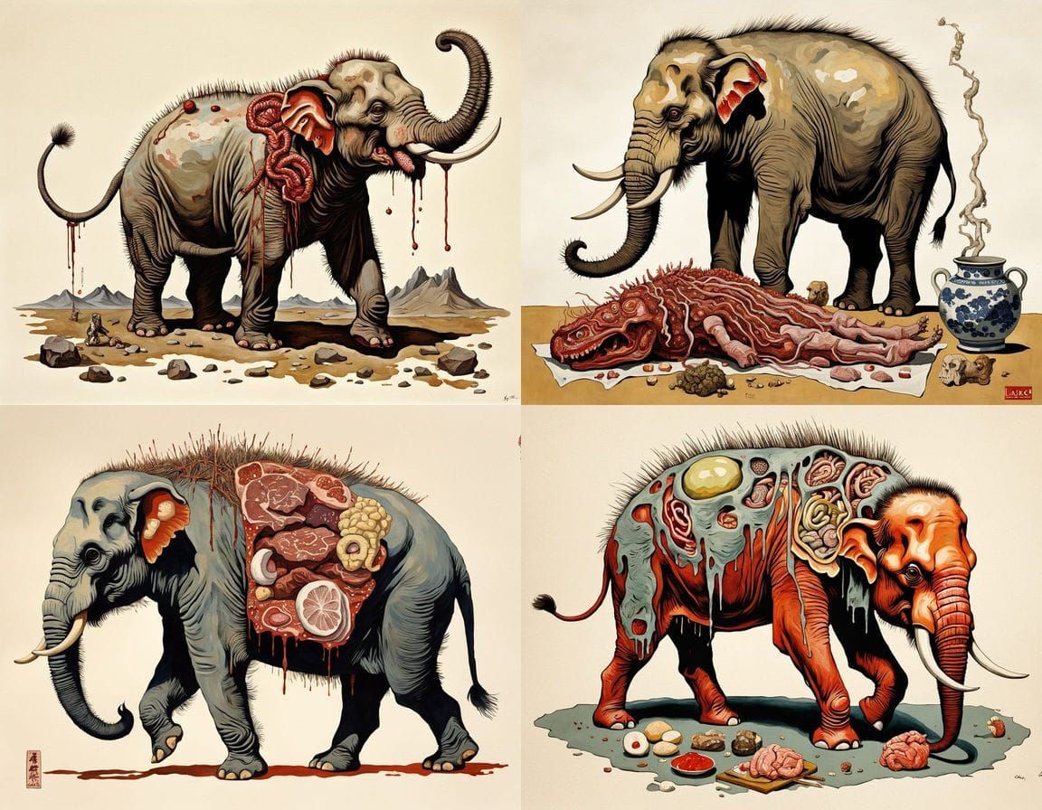 This surreal image depicts a grotesque hybrid creature, blending elements of mythical beasts with anatomical horror. Rendered in an expressive oil painting style reminiscent of Egon Schiele.