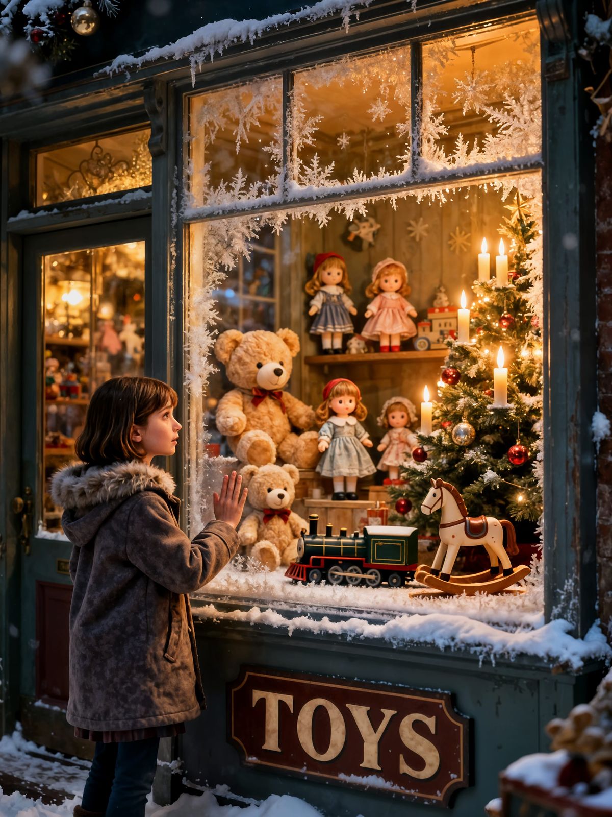 A hyperrealistic image of a cozy, vintage toy shop window displaying teddy bears, dolls, and a train, with a child gazing in wonder at the magical Christmas scene.
