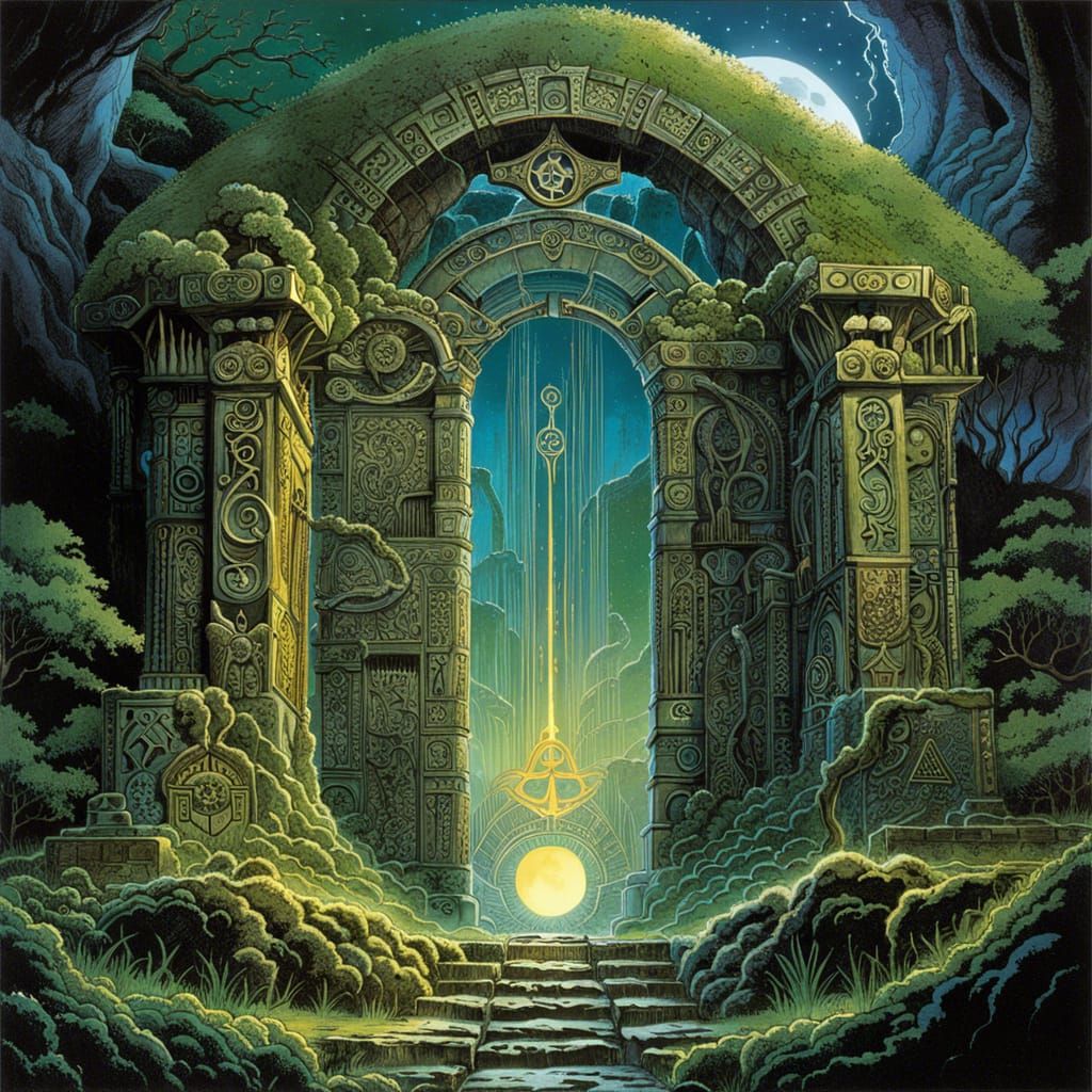 This image shows a moss-covered, runic gate in a moonlit valley. The digital art evokes a retro, science-fantasy aesthetic with cosmic and tarot elements.